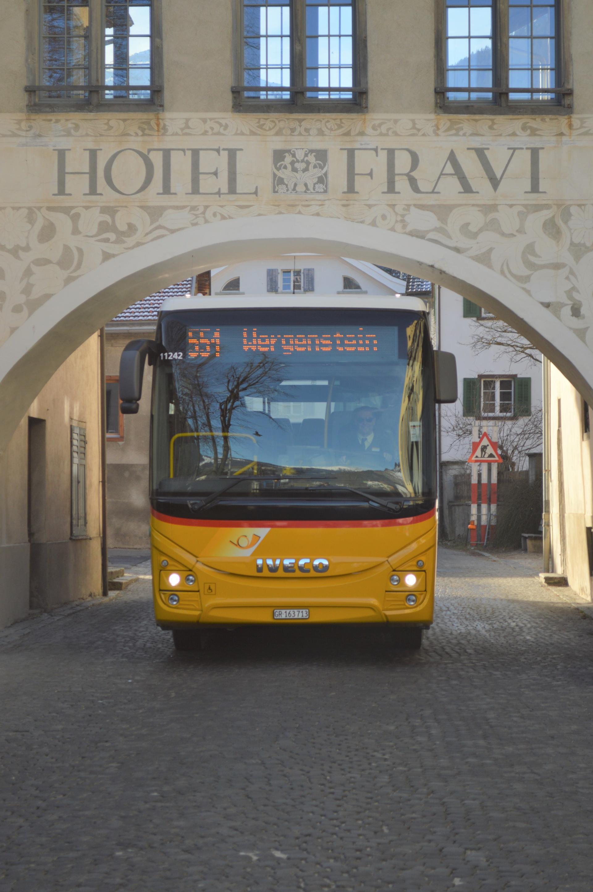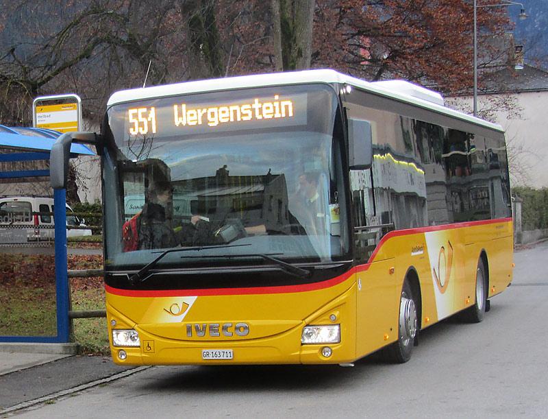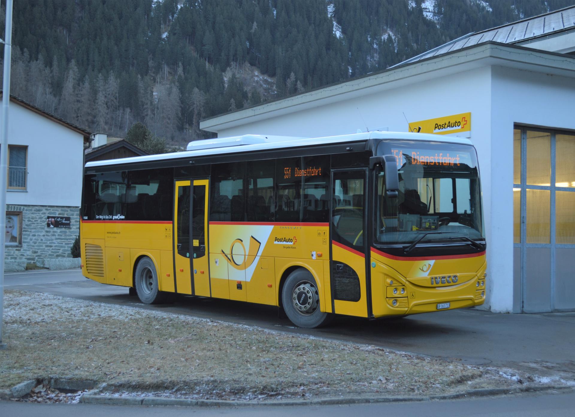Der Ersatz für unseren Irisbus GR 163715 ist im Einsatz. Speziell am Fahrzeug ist, dass er ein Voith Mildhybrid-Getriebe verbaut hat. Auch der Fahrer-Arbeitsplatz wurde durch Iveco erneuert. Das Fahrzeug fährt sich sehr komfortabel. Äusserlich sieht man, dass er zwei Kamelbuckel besitzt. Diese dienen dem Hybrid-Getriebe. Da die Gemeinde Mountagna da Schons romanisch sprechend ist, wurde das Fahrzeug rätoromanisch beschriftet. Im Einsatz ist er auf allen Wagen-Umläufen, teilweise mit Übernachtung in Juf oder Wergenstein.